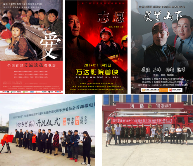 2014年拍攝了檢察院的《賀蘭山下》《黃河兒女》,消防總隊(duì)的《橙色閃耀寧夏川》《志愿》《石嘴山消防小蘋果》等,《志愿》作為第二屆寧夏消防微電影展映2014年11月7日在銀川西夏萬達(dá)影院舉行首映,并在全區(qū)影院展映一個(gè)月。2015年5月11號(hào)由銀川市委宣傳部、共青團(tuán)銀川市委、銀川日報(bào)、銀川晚報(bào)聯(lián)合舉辦的首屆“向上向善金河杯首屆微電影大賽”《志愿》榮獲全場一等獎(jiǎng),《賀蘭山下》榮獲二等獎(jiǎng),另《賀蘭山下》榮獲全國檢察系統(tǒng)防職務(wù)犯罪微電影優(yōu)秀作品獎(jiǎng)?!洞鷥r(jià)》反應(yīng)了一些違法份子通過制作及銷售假發(fā)票牟利,經(jīng)過地稅稽查局及公安的努力最終抓捕犯罪份子。與自治區(qū)民委合作拍攝了反應(yīng)回漢一家親親情感人民族題材作品《蘭香吳忠》。寧夏紀(jì)檢監(jiān)察系統(tǒng)首部廉政微電影《一家之主》推進(jìn)了黨風(fēng)廉政建設(shè)、加強(qiáng)和改進(jìn)廉政警示教育工作的新嘗試,做到以小見大,以影教人,以影化人的警示教育作用。首部艾滋遺孤公益微電影《愛》,講述是的患有艾滋病的患者因得不到及時(shí)有效的治療離開人世,自己的孩子變成孤兒,被身邊人孤立、嫌棄的真實(shí)故事。從一個(gè)艾滋遺孤的生活歷程,講述了一個(gè)讓人心痛,值得人深思的故事。希望喚醒人們的良知,去關(guān)注艾滋病患者,幫助艾滋病患者。公益微電影《紅手絹》講述小男孩走出大山來到城市里上大學(xué),但是“紅手絹”卻是男孩心中唯一放不下的,當(dāng)男孩回到大山里卻發(fā)現(xiàn)一直牽掛的“紅手絹”不在了……