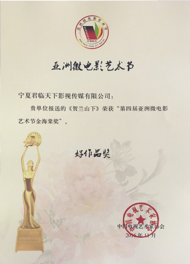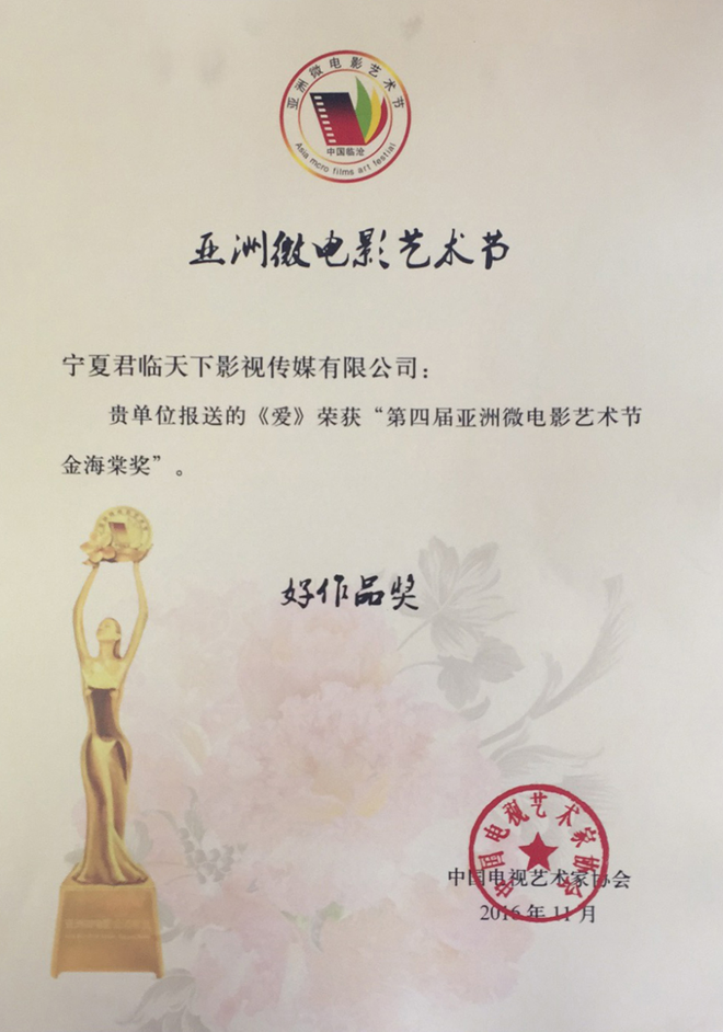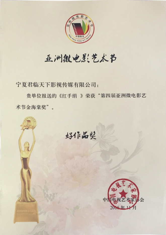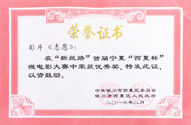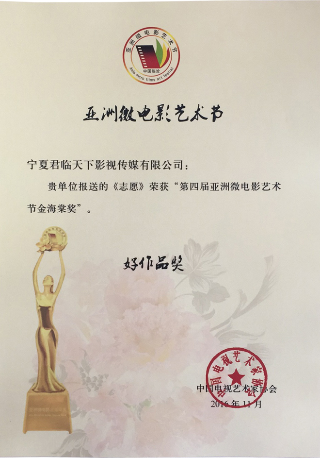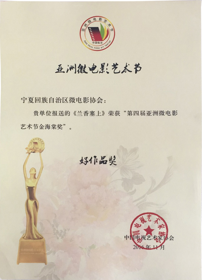 2016年第四屆亞洲國際微電影藝術(shù)節(jié),寧夏微電影協(xié)會(huì)出品的影片《愛》榮獲亞洲微電影金海棠“優(yōu)秀公益獎(jiǎng)”、“優(yōu)秀紀(jì)實(shí)獎(jiǎng)”,《蘭香塞上》榮獲亞洲微電影金海棠“優(yōu)秀攝影獎(jiǎng)”和中國金風(fēng)箏國際微電影獎(jiǎng)“優(yōu)秀作品獎(jiǎng)”、《賀蘭山下》《紅手絹》《志愿》榮獲亞洲微電影金海棠“好作品獎(jiǎng);寧夏微電影協(xié)會(huì)主席魏軍榮獲“十佳制片獎(jiǎng)”。其中寧夏回族自治區(qū)民族事務(wù)委員會(huì)與寧夏微電影協(xié)會(huì)聯(lián)合出品的影片《蘭香塞上》榮獲亞洲微電影金海棠“優(yōu)秀攝影獎(jiǎng)”、“好作品獎(jiǎng)”,寧夏微電影協(xié)會(huì)與香港智行基金會(huì)聯(lián)合出品影片《愛》榮獲亞洲微電影金海棠“最佳公益獎(jiǎng)”、“最佳紀(jì)實(shí)獎(jiǎng)”、“好作品獎(jiǎng)”,寧夏公安消防總隊(duì)與寧夏微電影協(xié)會(huì)聯(lián)合出品的《志愿》榮獲亞洲微電影金海棠“好作品獎(jiǎng)”,石嘴山大武口區(qū)檢察院與寧夏君臨天下影視傳媒有限公司聯(lián)合出品的《賀蘭山下》榮獲亞洲微電影金海棠“好作品獎(jiǎng)”、榮獲“金河杯”“向上向善 最美銀川”首屆微視大賽微電影三等獎(jiǎng),寧夏微電影協(xié)會(huì)與銀川新聞網(wǎng)聯(lián)合出品的影片《紅手絹》榮獲亞洲微電影金海棠“好作品獎(jiǎng)”。