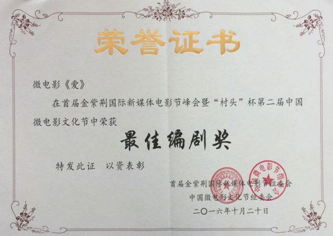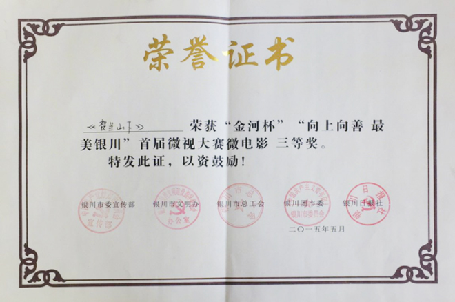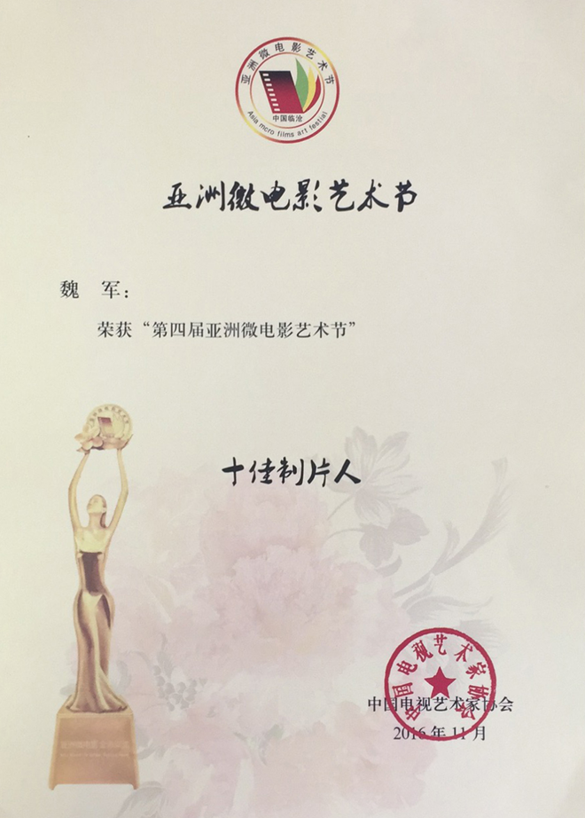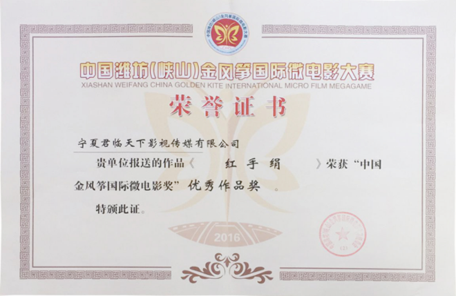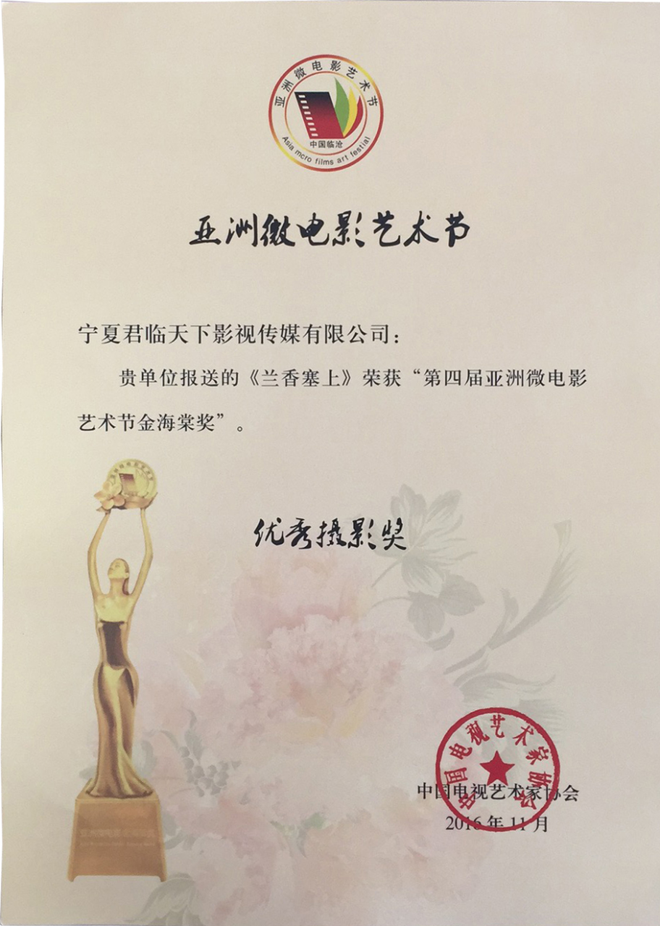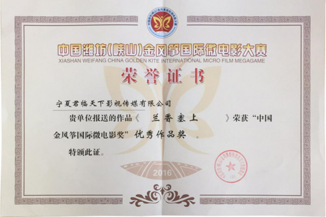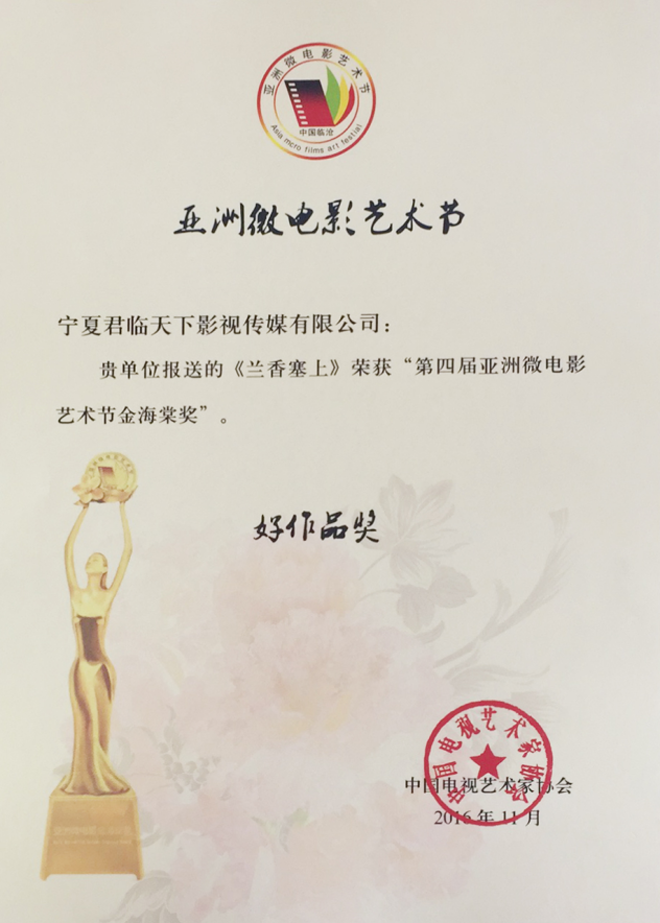 2016年第四屆亞洲國際微電影藝術(shù)節(jié),寧夏微電影協(xié)會(huì)出品的影片《愛》榮獲亞洲微電影金海棠“優(yōu)秀公益獎(jiǎng)”、“優(yōu)秀紀(jì)實(shí)獎(jiǎng)”,《蘭香塞上》榮獲亞洲微電影金海棠“優(yōu)秀攝影獎(jiǎng)”和中國金風(fēng)箏國際微電影獎(jiǎng)“優(yōu)秀作品獎(jiǎng)”、《賀蘭山下》《紅手絹》《志愿》榮獲亞洲微電影金海棠“好作品獎(jiǎng);寧夏微電影協(xié)會(huì)主席魏軍榮獲“十佳制片獎(jiǎng)”。其中寧夏回族自治區(qū)民族事務(wù)委員會(huì)與寧夏微電影協(xié)會(huì)聯(lián)合出品的影片《蘭香塞上》榮獲亞洲微電影金海棠“優(yōu)秀攝影獎(jiǎng)”、“好作品獎(jiǎng)”,寧夏微電影協(xié)會(huì)與香港智行基金會(huì)聯(lián)合出品影片《愛》榮獲亞洲微電影金海棠“最佳公益獎(jiǎng)”、“最佳紀(jì)實(shí)獎(jiǎng)”、“好作品獎(jiǎng)”,寧夏公安消防總隊(duì)與寧夏微電影協(xié)會(huì)聯(lián)合出品的《志愿》榮獲亞洲微電影金海棠“好作品獎(jiǎng)”,石嘴山大武口區(qū)檢察院與寧夏君臨天下影視傳媒有限公司聯(lián)合出品的《賀蘭山下》榮獲亞洲微電影金海棠“好作品獎(jiǎng)”、榮獲“金河杯”“向上向善 最美銀川”首屆微視大賽微電影三等獎(jiǎng),寧夏微電影協(xié)會(huì)與銀川新聞網(wǎng)聯(lián)合出品的影片《紅手絹》榮獲亞洲微電影金海棠“好作品獎(jiǎng)”。