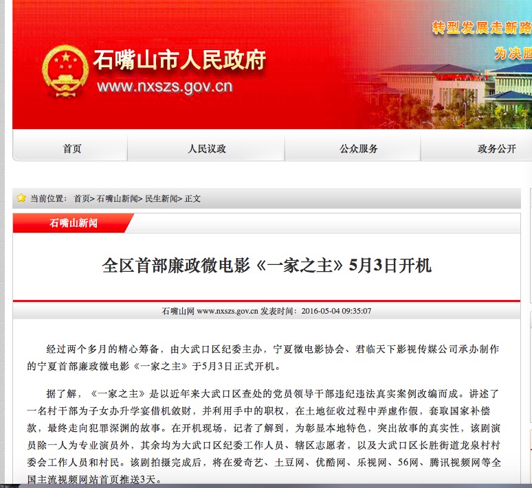 中國影視娛樂訊:2016年05月03日,由石嘴山市大武口區(qū)紀委、寧夏回族自治區(qū)微電影協(xié)會聯(lián)合出品,君臨天下影業(yè)攝制的寧夏紀檢監(jiān)察系統(tǒng)首部廉政微電影《一家之主》開機儀式在石嘴山市大武口區(qū)紀委會議室舉行。