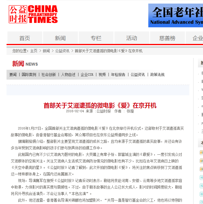 2016年1月27日,全國首部關(guān)注艾滋病遺孤的微電影《愛》在北京舉行開機儀式。這部取材于艾滋遺孤真實故事的微電影,由香港智行基金會籌拍,其眾籌項目也在京東公益頻道同步上線。