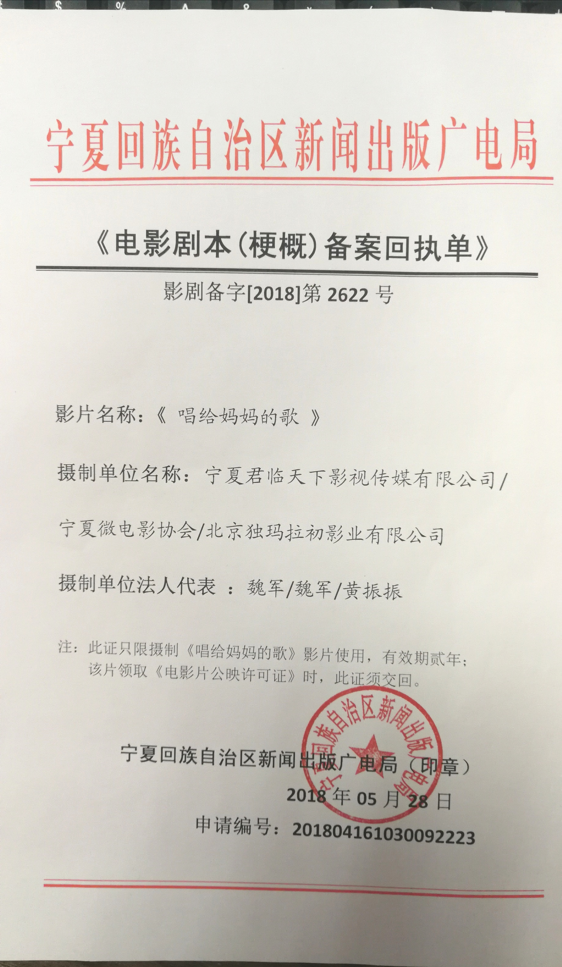 近日,院線電影《唱給媽媽的歌》電影劇本獲國家電影局批復(fù),允許該片拍攝。公益院線電影《唱給媽媽的歌》由劉德信編劇,魏亞平擔(dān)任制片人,由教育部國家級(jí)創(chuàng)新創(chuàng)業(yè)導(dǎo)師、中阿國際微電影節(jié)組委會(huì)主席、cctv7美麗鄉(xiāng)村國際微電影藝術(shù)節(jié)西北賽區(qū)執(zhí)行主席、寧夏回族自治區(qū)青年拔尖人才魏軍擔(dān)任總導(dǎo)演。